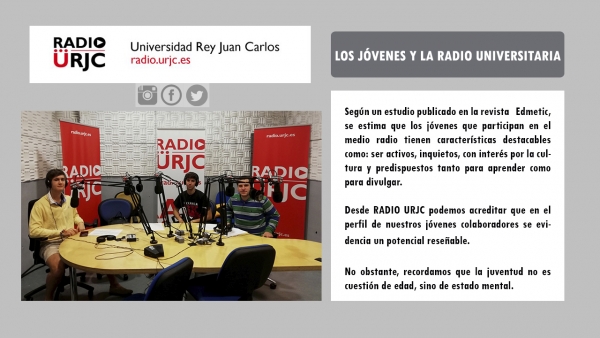 Es evidente que hay muchos jóvenes que no participan o experimentan en el medio radiofónico y que igualmente poseen extraordinarias cualidades, pero desde RADIO URJC sí podemos acreditar que en el perfil de nuestros colaboradores se evidencia un potencial reseñable.